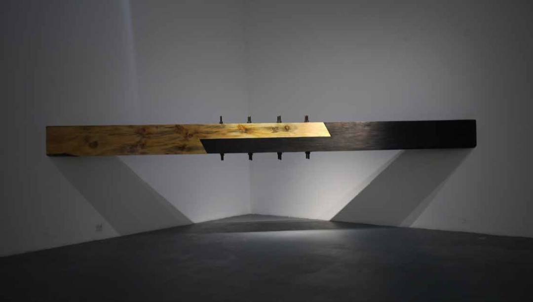 本次展览以“楔子”为主题,从 2018 年至今,傅中望把精力更多地放在创作“楔子”系列作品上。在20世纪 80 年代末,傅中望已经开始了“楔子”的相关创作,不过当时基本上还是以木材为媒介制作一些具有榫卯特点的作品,只是近作彻底改变了方向,即不再考虑造型与观赏的问题,而是或者在不同的现场实施打入楔子的行为,或者借助于科技手段,在一些影像中将楔子“打入”不同的建筑与现场中。