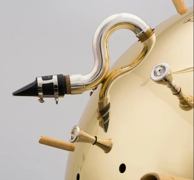呼吸共鸣,2019,黄铜,竹筒,不同的管乐器吹口,多种金属,H80 x W100 x D100 cm © 图片由艺术家提供